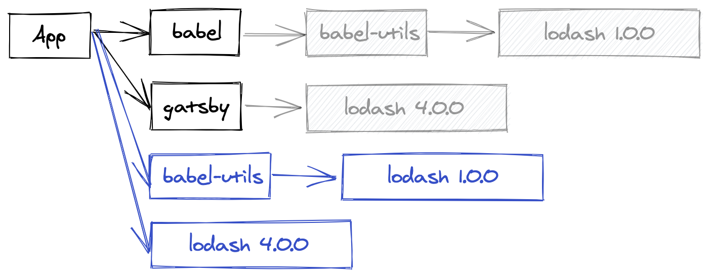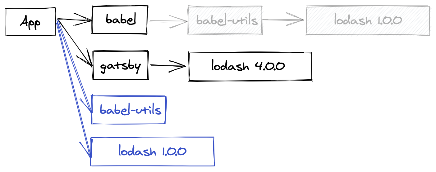 First, let's check that this layout is valid: Gatsby still gets its Lodash 4 dependency, the Babel utility package still gets Lodash 1, and Babel itself still gets the utility package, just like before. But something else changed! Babel will no longer access Lodash 1! It'll instead retrieve the Lodash 4 copy that Gatsby provided, likely incompatible with whatever Babel originally expected. In the best case the application will crash, in the worst case it'll silently pass and generate incorrect results.